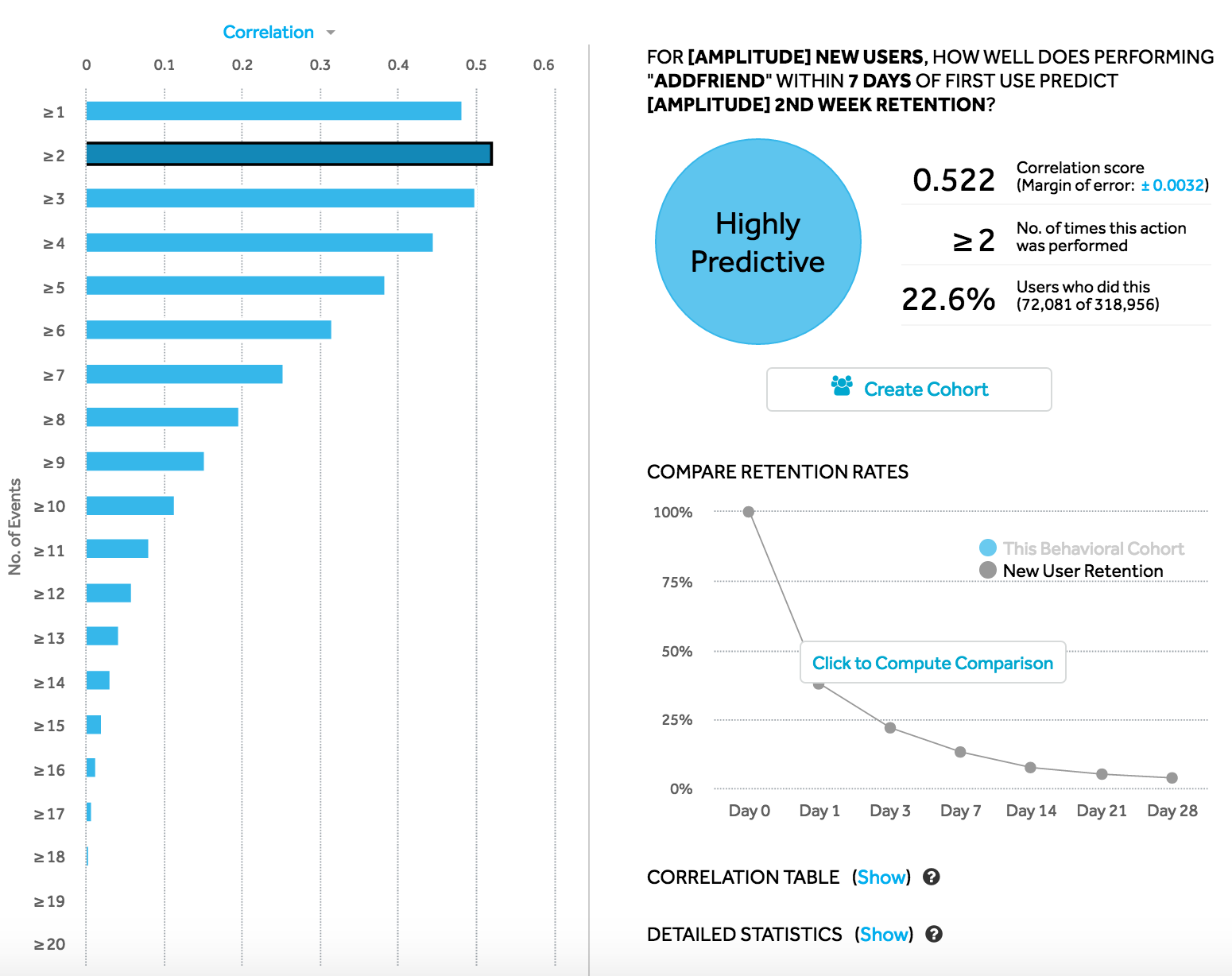The proportion above threshold tells you how many new users actually triggered the event in their first N days. This matters because there must be a large enough sample of users meeting the threshold for Compass to understand how well it correlates with retention.