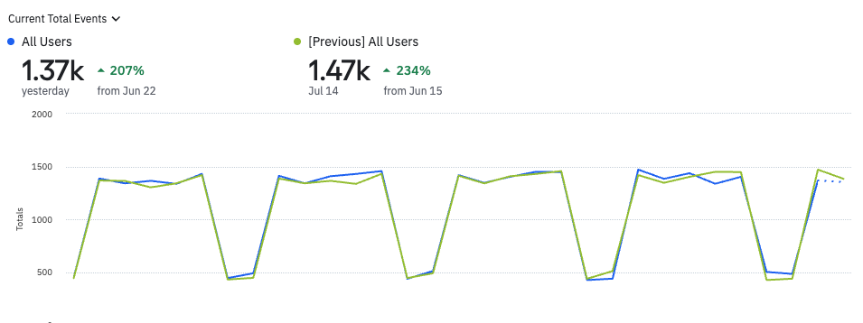 Below, the the event totals display with a rolling window of seven days. Each day represents a sum of the previous seven days worth of events.