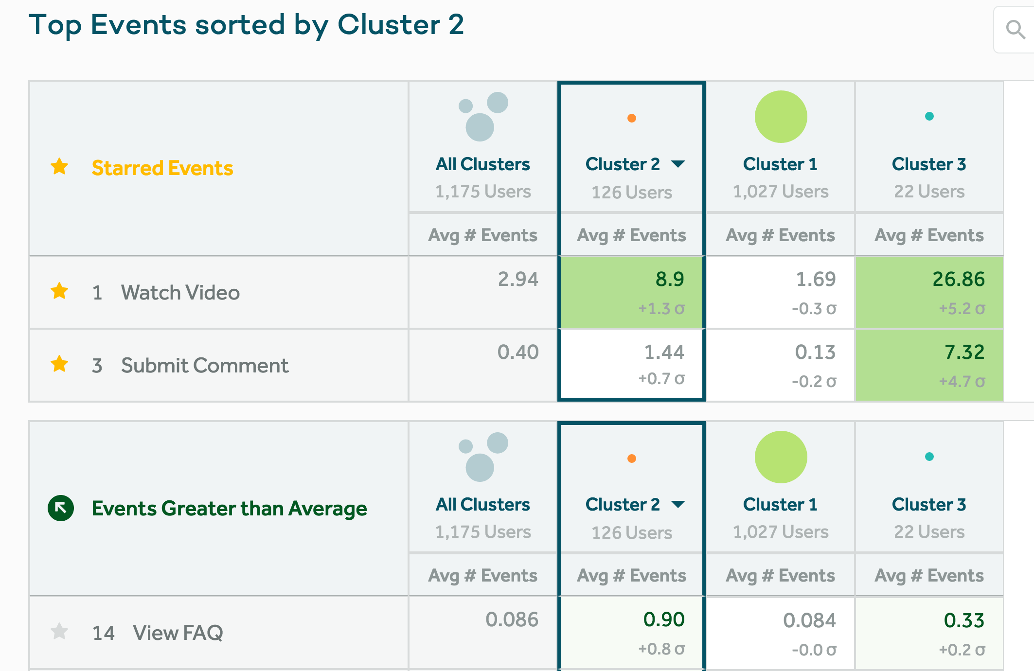 Notice that whenever you choose a new cluster to use for sorting the table, the lists of events changes as well. That's because each cluster should exhibit a different pattern of behavior within your product, which means they'll almost certainly be firing events at different rates from each other.