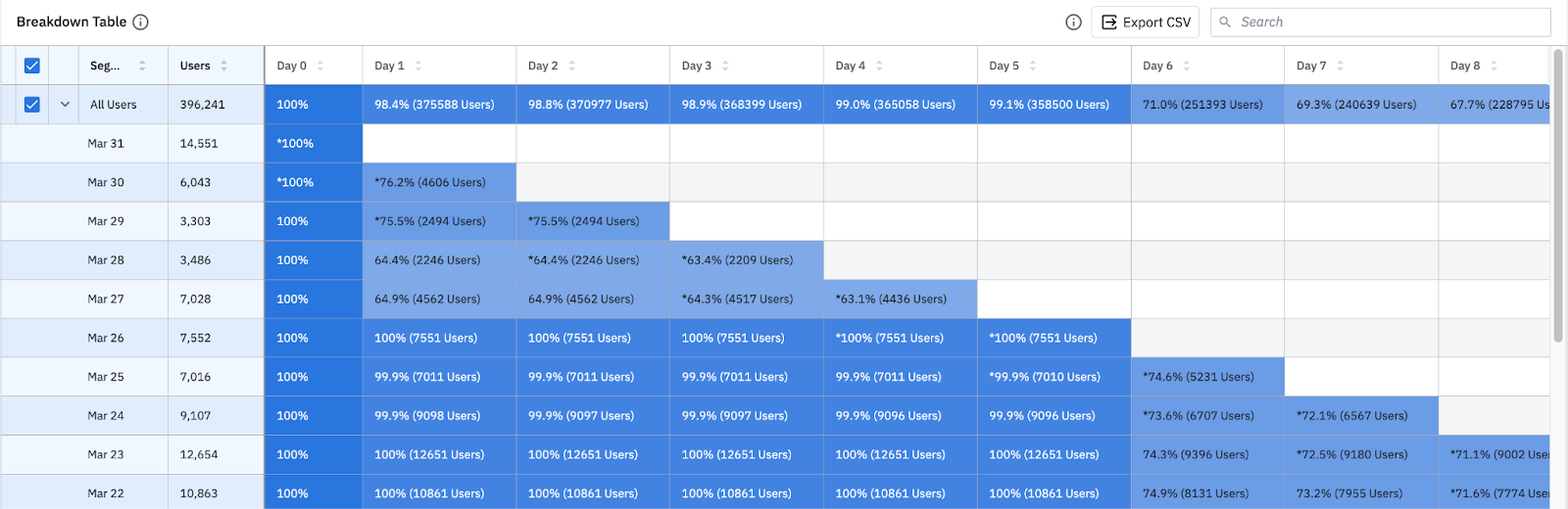 Amplitude also displays a detailed table breaking down the data, broken out by each user cohort and into individual day buckets.