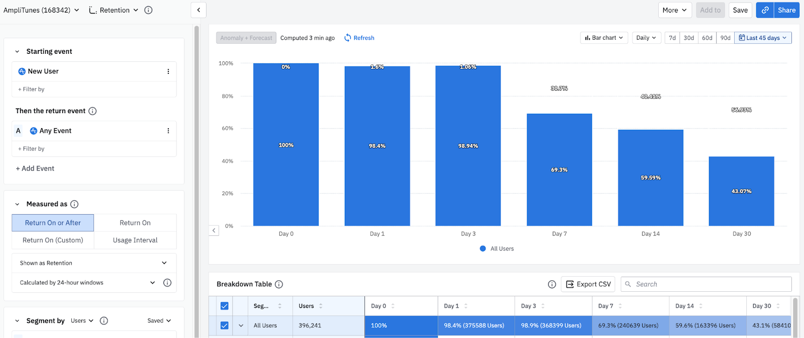 When you first open the Retention Analysis chart, the Return On or After retention graph by default shows retention for new users who returned any event. To see exact percentages, hover over the data point for the day you’re interested in, or click it to inspect the users at that interval (see the Help Center article on Amplitude’s Microscope feature to learn more).