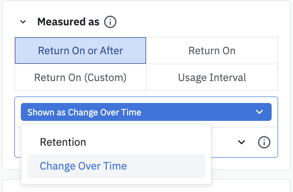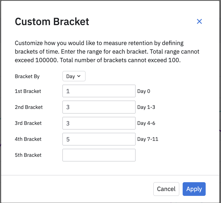 By default, Amplitude assumes you’ll want to use predefined units of time — days, weeks, months, etc. — as retention brackets for your retention analyses. But you can change this by using Return On (Custom) and instead create custom brackets for your Return On retention.