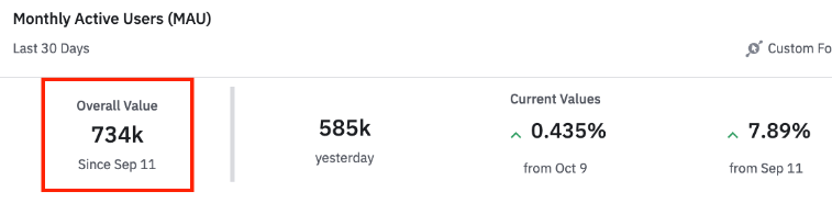 In another example, look at an Event Segmentation chart with a custom formula. In this scenario, Display takeaway metrics is still on, only now there's an Overall Value that's a count of active users. Although the next three examples highlight counts of active users over the same 30 days, the Overall Value varies because of the different windows (daily, weekly, or monthly):