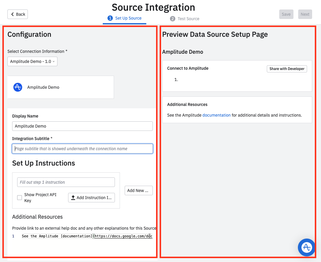 Add as many setup steps as you need, but aim for no more than 5-8. You can include images that help orient your users. Mark Show Project API Key to automatically pull the relevant Project API on behalf of the user. Remember that all sources and destinations for Amplitude are configured on the project level, not the organization level.