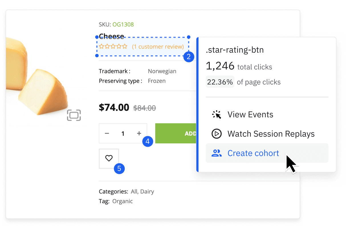 Explora los clics, los desplazamientos y los elementos personalizados para comprender cómo interactúan los usuarios con tu sitio web, desde cuando pulsan en un CTA hasta las zonas de abandono.