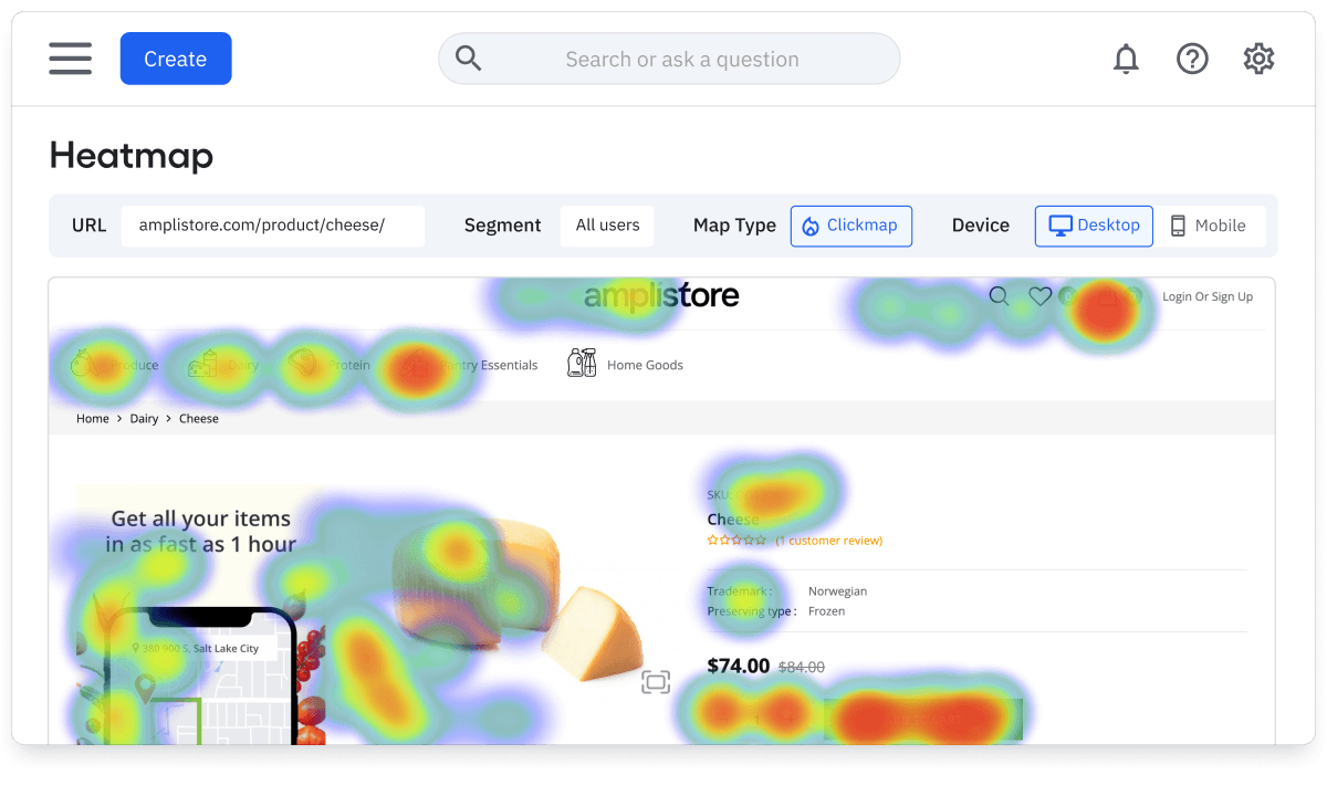 Identifica de un vistazo lo que llama la atención y lo que no. Los mapas de calor de Amplitude muestran los clics, los desplazamientos y las zonas de mayor interacción en tu sitio o aplicación web.