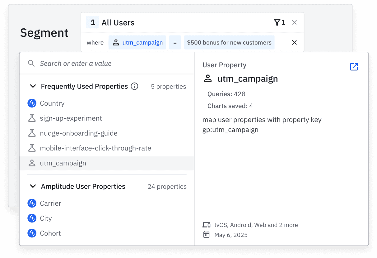 Los mapas de calor de Amplitude están integrados en una plataforma unificada; no son una herramienta independiente. Esto significa que no tienes que conformarte solo con imágenes y datos superficiales; puedes conectar los mapas de calor con los recorridos, los embudos y la segmentación avanzada.