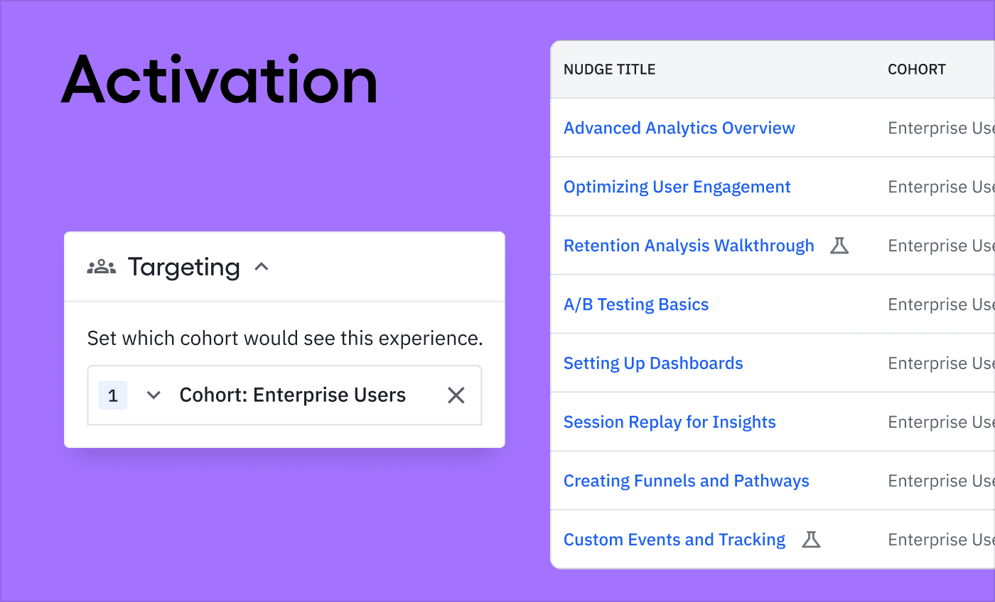Build personalized guides and surveys using behavioral cohorts and understand how your users interact with them.