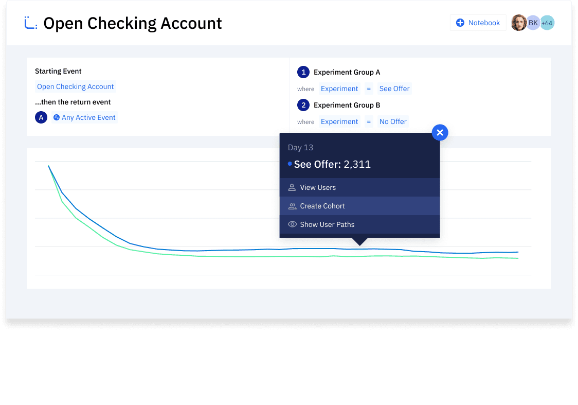 Compare product engagement between user groups to see exactly how campaigns, channels, and feature adoption impacts your downstream metrics.