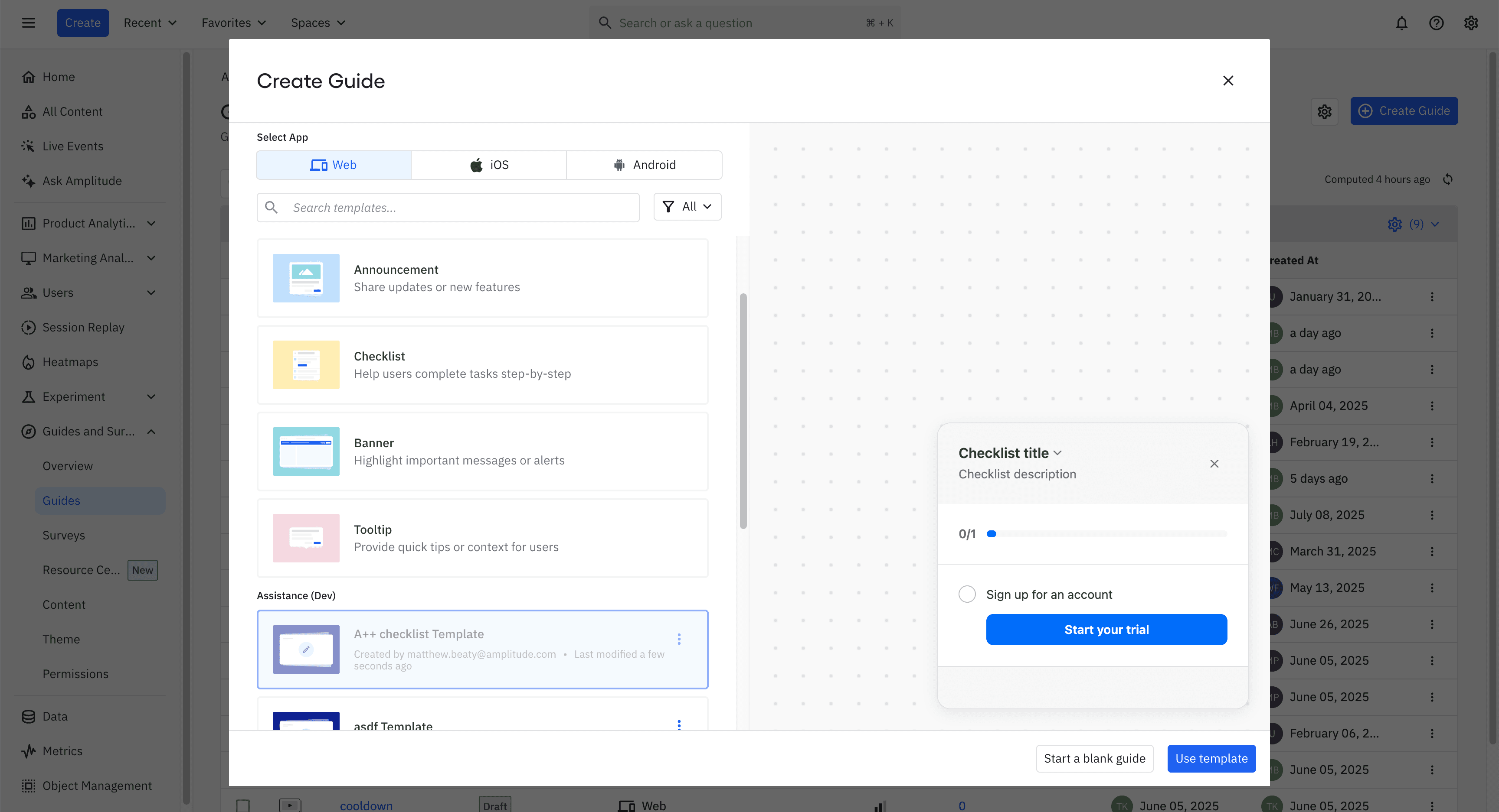 Description: Create custom, high-quality templates of guides and surveys for your team to reuse. This can include custom designs and/or unique trigger and targeting rules. Bonus: Preview templates directly in the create flow modal!