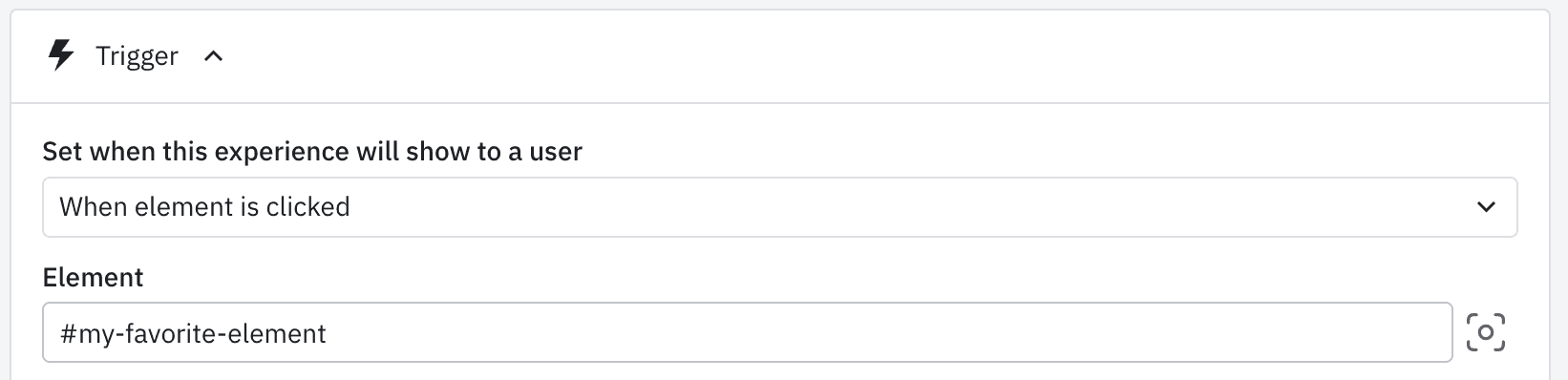 Why: Triggering a guide or survey on element click required instrumenting your app to track an event or call our SDK. The "when element is clicked" trigger enables you to visually select the element in your application with our click selector.