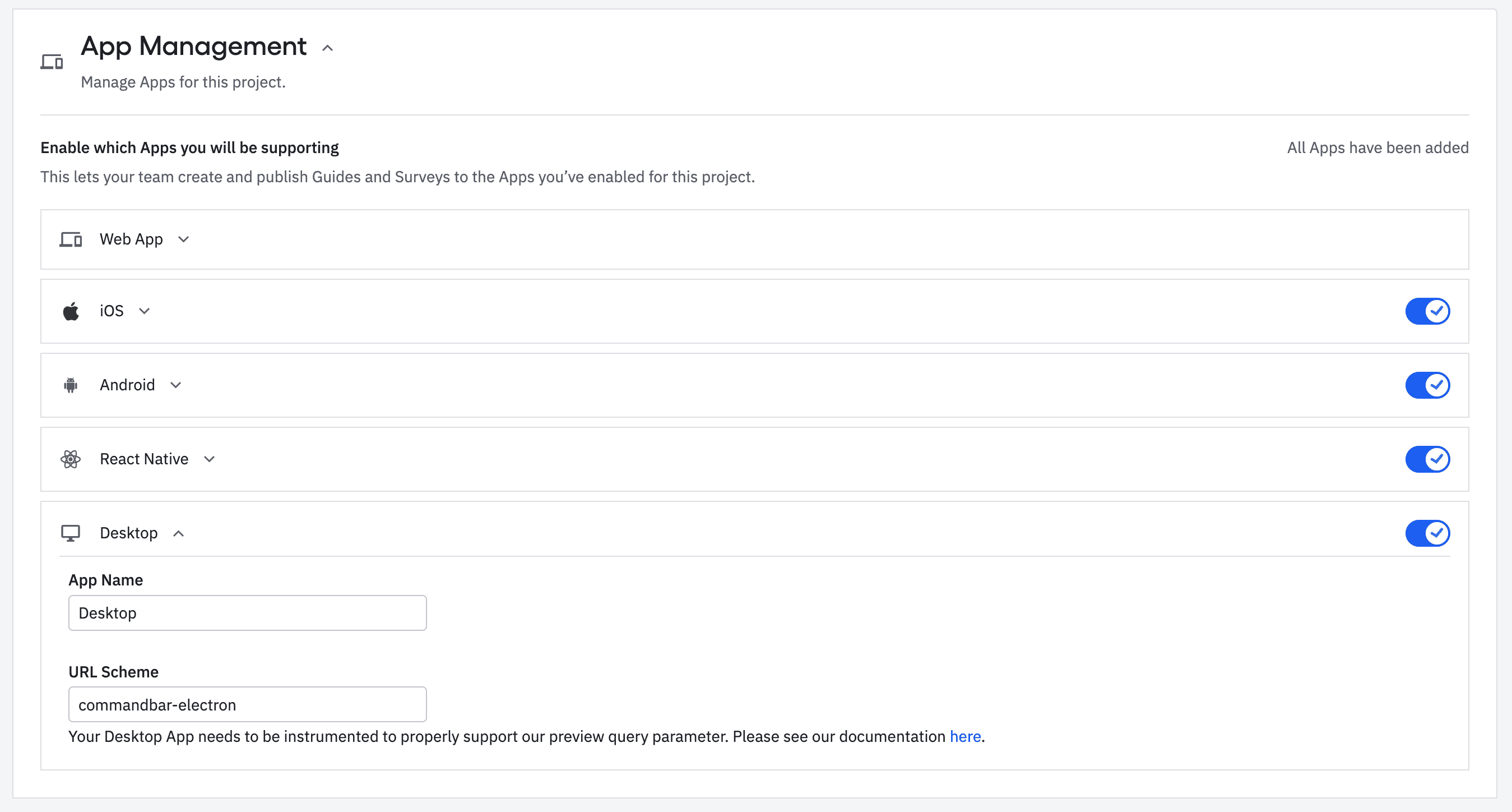 Why: Desktop-type apps have different requirements than a standard web app. By letting our users specify a guide or survey is intended for their desktop apps we'll be able to tailor different experiences and setup appropriately within the dashboard.