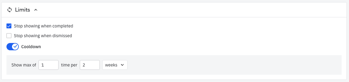 Description: Instead of just being able to specify how many times a guide or survey should trigger per day/week/month, you can now quantify the period as well. It’s a small change for us, but it is very effective. Bonus: There is a year option now as well.