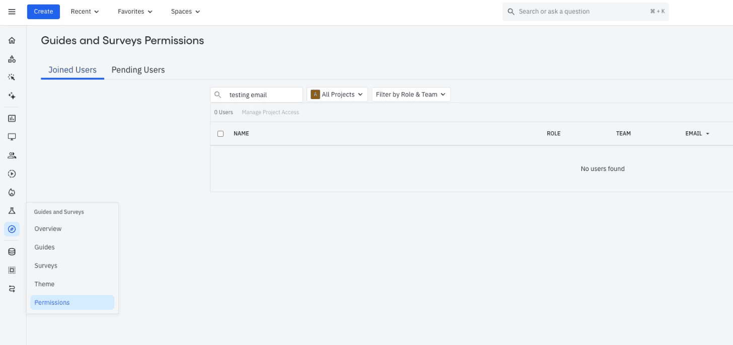 Restrict publishing rights to protect your end-user experience Grant Guides and Surveys permissions independently from analytics access Create customized permission sets that align with your team structure This powerful feature respects all dimensions of your team's roles, including organization roles, project roles, and our new Guides and Surveys product roles.