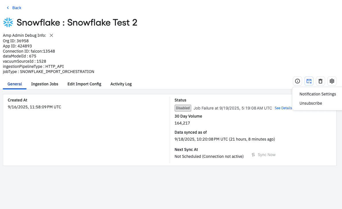Where: In the notifications menu of a Data Warehouse source or destination (the envelope icon)