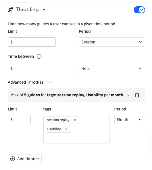 Why: We want guides and surveys to be non-annoying, and this resonates very well with our customers, who frequently ask for more fine-grained throttling capabilities.