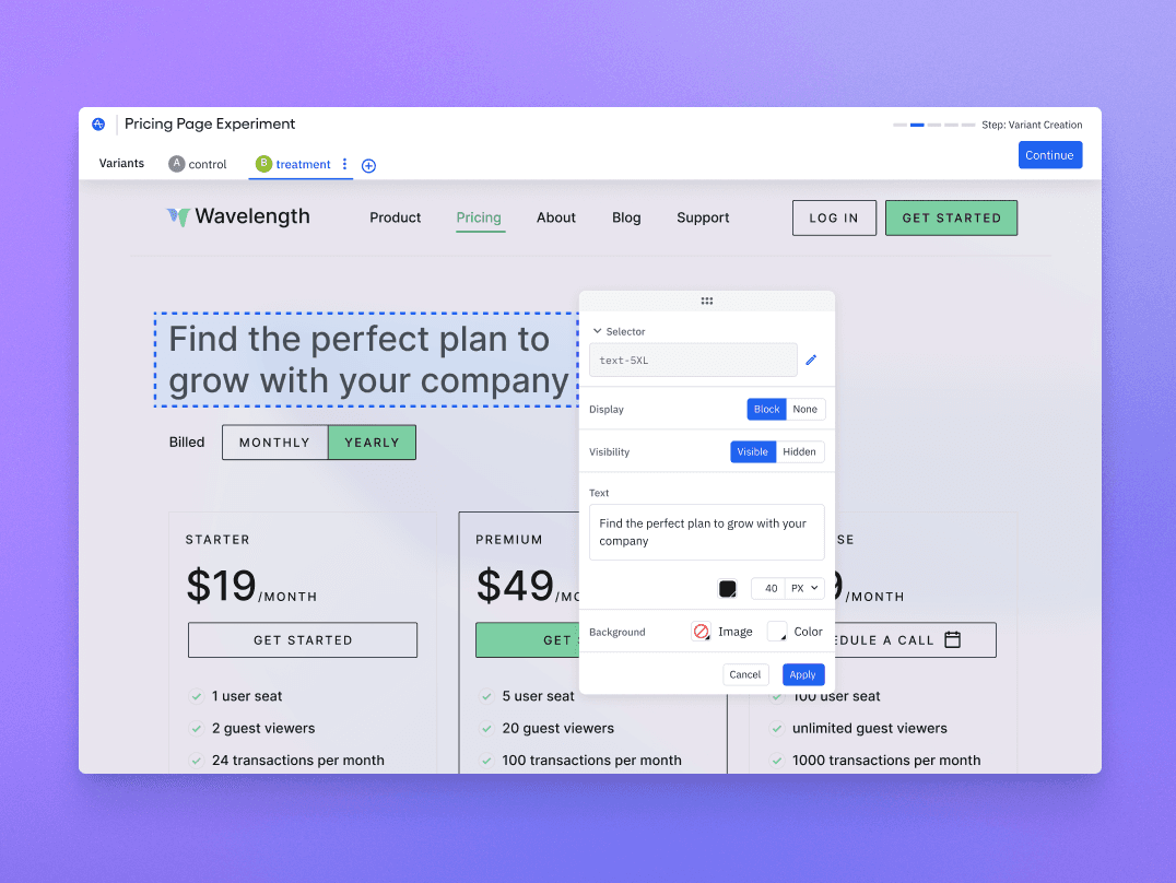 Get started immediately with our free Starter plan that includes core Web Experimentation features like the visual experiment editor and page-level targeting.